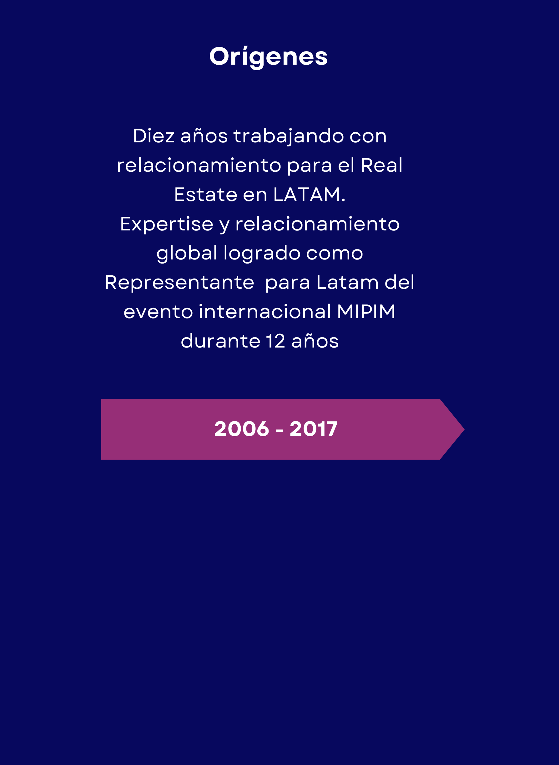 Empresaria con más de 20 años de experiencia profesional concentrada en el mercado del Real Estate de Latinoamérica. Su especialidad es relacionar a los players de la región a través de los diferentes productos y servicios que ha creado a lo largo de su carrera.
